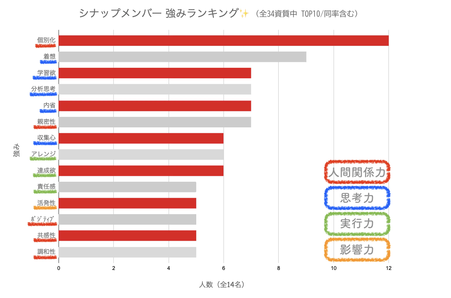 まず下記、メンバー全員のテスト結果から出したグラフとなります。全メンバー14名(2025年9月現在)、各々の結果からまず強みとなる資質TOP10を抽出、そこから保持者の多い順に10位までを並べた、さながらシナップ 資質・強みランキングです。