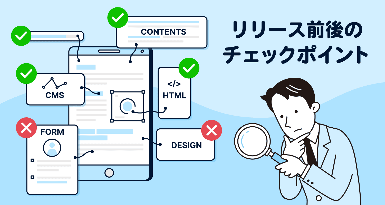 また、リース公開前後は慌ただしい状態になることも多いため、予め用意しておいたチェック項目に沿って対応していくとスムーズです。チェックシートを有効活用をして効率的かつWebサイトの品質を高めていきましょう。